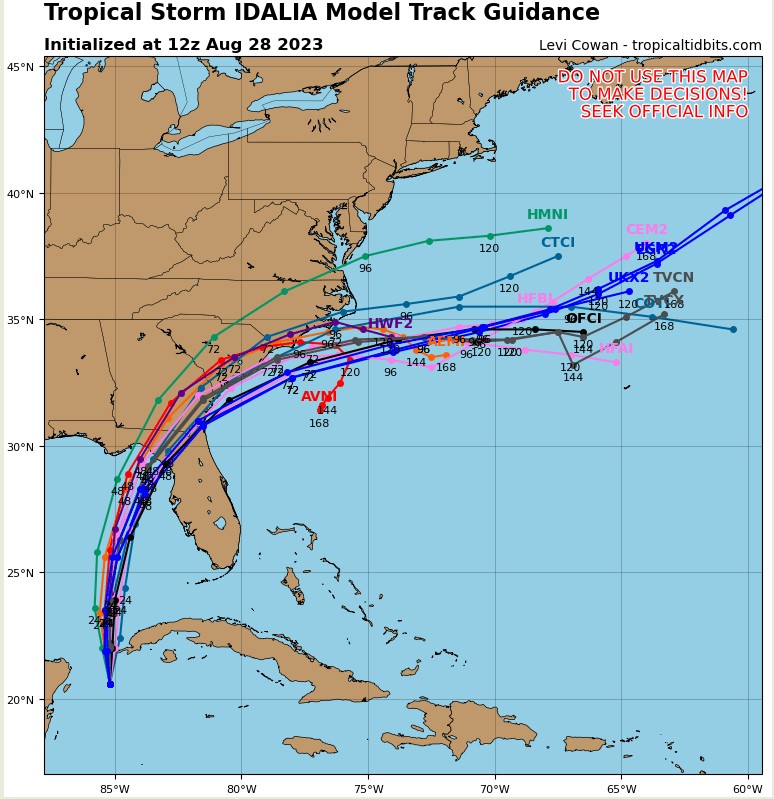 Area of Interest: Tropical Storm Idalia, located about 120 miles south of the western tip of Cuba, and is moving slowly northward with 65-mph maximum sustained winds. Idalia is likely to continue on a slow northward course and is forecast to become a hurricane later today. Afterwards, Idalia is forecast to strengthen more rapidly while moving faster north-northeastward to northward toward Florida, where it will most likely make landfall somewhere between the Apalachee Bay and the Florida Big Bend. On this track, heavy rains and tropical-storm-wind-force winds, along with the threat of storm surge, are likely to be felt along the southwest coast of the SFWMD on Tuesday and inland areas northwest of Lake Okeechobee late Tuesday through midday Wednesday. Rains and winds would gradually diminish from south to north and subside completely over the northwestern part of the SFWMD by Wednesday afternoon. These rain and wind effects will be felt well outside the forecast cone and could become more pronounced if the storm grows larger in size before making landfall, is stronger than forecast, or if the track nudges slightly east. SFWMD interests in the watch areas are advised to take the necessary preparedness actions, and all others are advised to continue closely monitoring the progress of Idalia.
