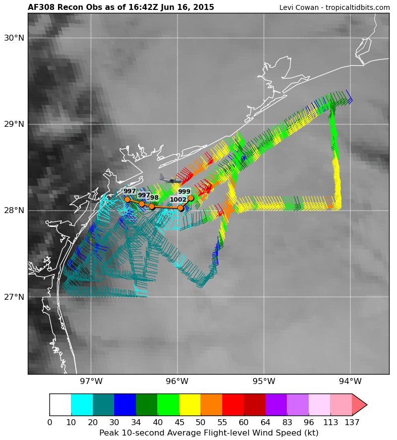 Maximum Flight Level Wind Outbound: 35kts (~ 40.3mph) which was observed 35 nautical miles (40 statute miles) to the SW (215°) from the flight level center at 16:00:30Z