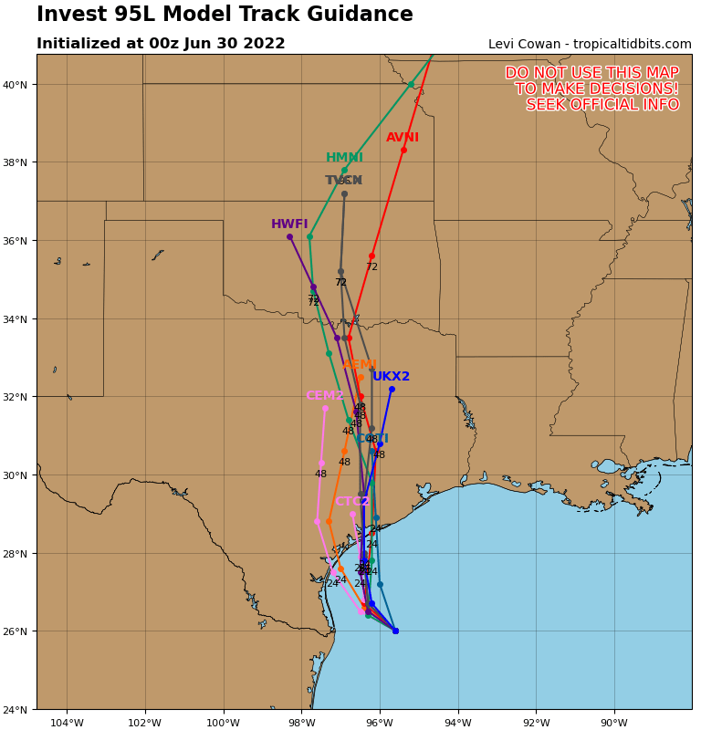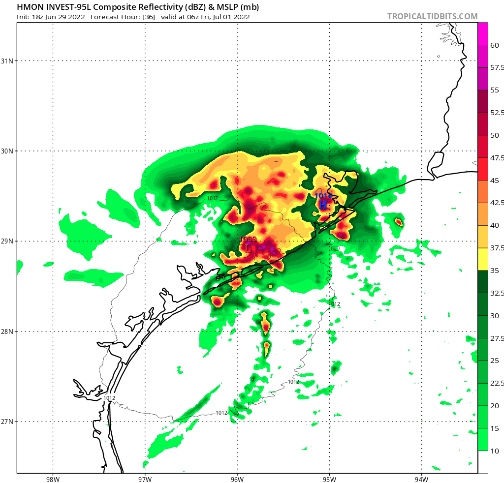 One thing to keep in mind... the remnant LLC will continue to push into Texas in the days post "landfall". It'll also continue to pose a risk of localized heavy rain events. Even if the risk of flooding is greatest along the coast and further east (day of)... the chance of beneficial rain and some heavy rain may linger, expand inland in the days following.Cpv17 wrote: ↑Wed Jun 29, 2022 9:24 pmYeah that sounds about right.Stratton20 wrote: ↑Wed Jun 29, 2022 9:12 pm Cpv17 00z HRRR is not our friend either , focuses the heavier rains toward beaumont and most of SE Texas except for coastal communities get shafted
