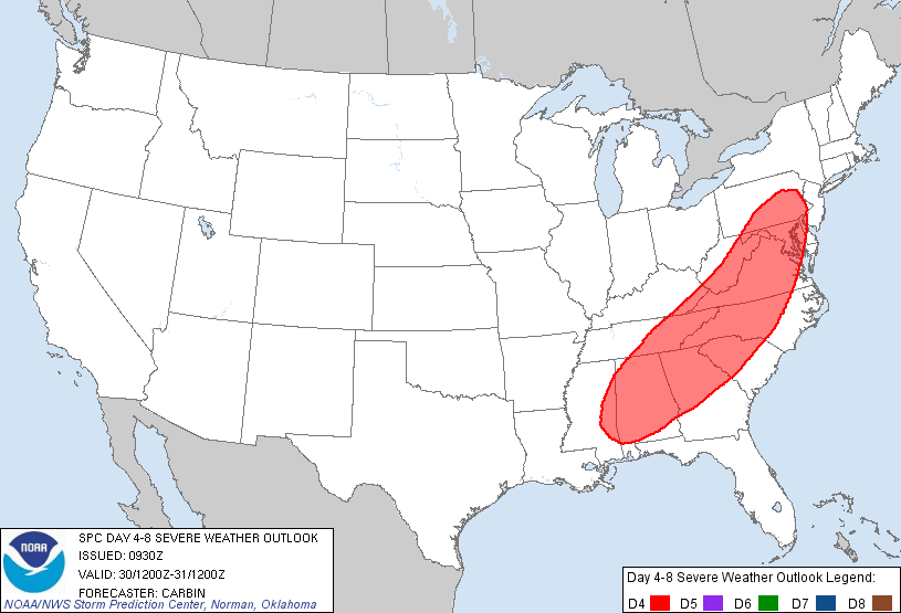 The trends overnight via the Global operational ensemble guidance suggest a severe weather episode has increased once again after a couple of days of model flip flopping. The main concerns appear to be damaging winds and hail with perhaps an isolated tornado or two from NE Texas into Arkansas, Louisiana and on E across the Northern Gulf Coast States. The SPC has once again outlined a Day 4/5 Risk area, but some uncertainty remains and the Outlook area may be reconfigured as we get closer to the Tuesday/Wednesday time frame. In the cold sector, light to moderate snow can be expected across portions of New Mexico and the TX/OK Panhandle Region. Should the trends continue the severe potential may increase further to our E into Tennessee, Mississippi, Alabama and Georgia.