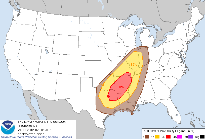 Ed, my' favored' has been Eastern OK/AR/W TN/LA/MS/AL for this episode. I also suspect a Slight Risk may be forthcoming W of the Metroplex near Brownwood. The dry line on E will need to be watched carefully tomorrow. The 12Z 4km WRF was rather impressive.