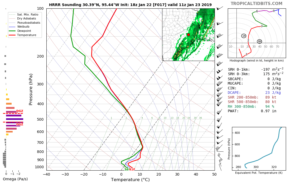 HRRR shows a very large warm nose over northern sections of SE Texas tomorrow morning. Not very confident anyone will see anything more than ice pellets unless mesoscale models are heavily overestimating the depth of the warm nose. Not much room for evaporative cooling either. Best bet is for just rain and cold (the worst combination).