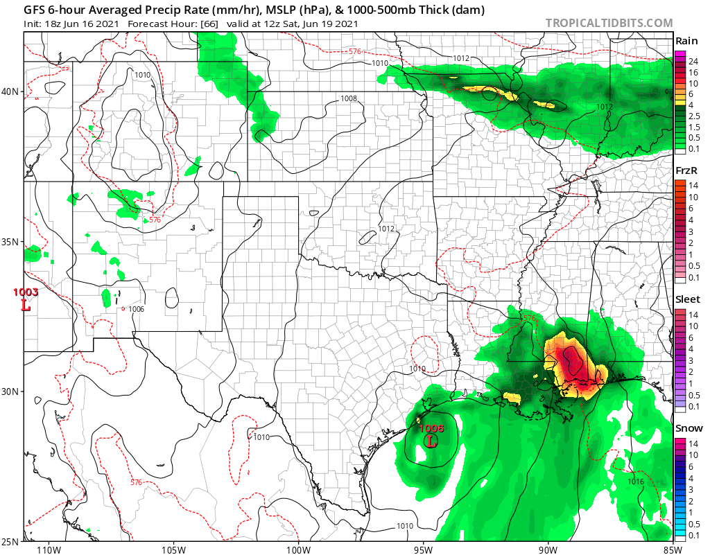 18Z GFS, you can see the split of energy with the main center close to the upper Texas coast, with a separate piece of energy in Mississippi.The vorticty is also helping to rob moisture away from the main storm. Seems like whats giving the models a hard time is the split of energy that occurs between the main circulation and vorticity on the north side of the storm. In some runs the northern vorticity becomes the main circulation and pulls off to the northeast. While in other runs the models show the main circulation remaining separated from the vorticity to the north.And continuing further west until the trough picks up the storm.