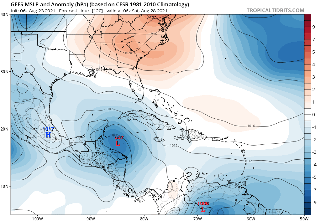Invest on Friday?srainhoutx wrote: ↑Mon Aug 23, 2021 9:27 am Looking like the tropical wave entering the Caribbean Sea will begin to slow down later this week as it enters the NW Caribbean. The ensembles are very bullish on lowering pressure and likely genesis by Friday. We will be in the monitoring and watching mode until tropical system actually develops, if it does. I will not be surprised to see an Invest declaration before the day is done.