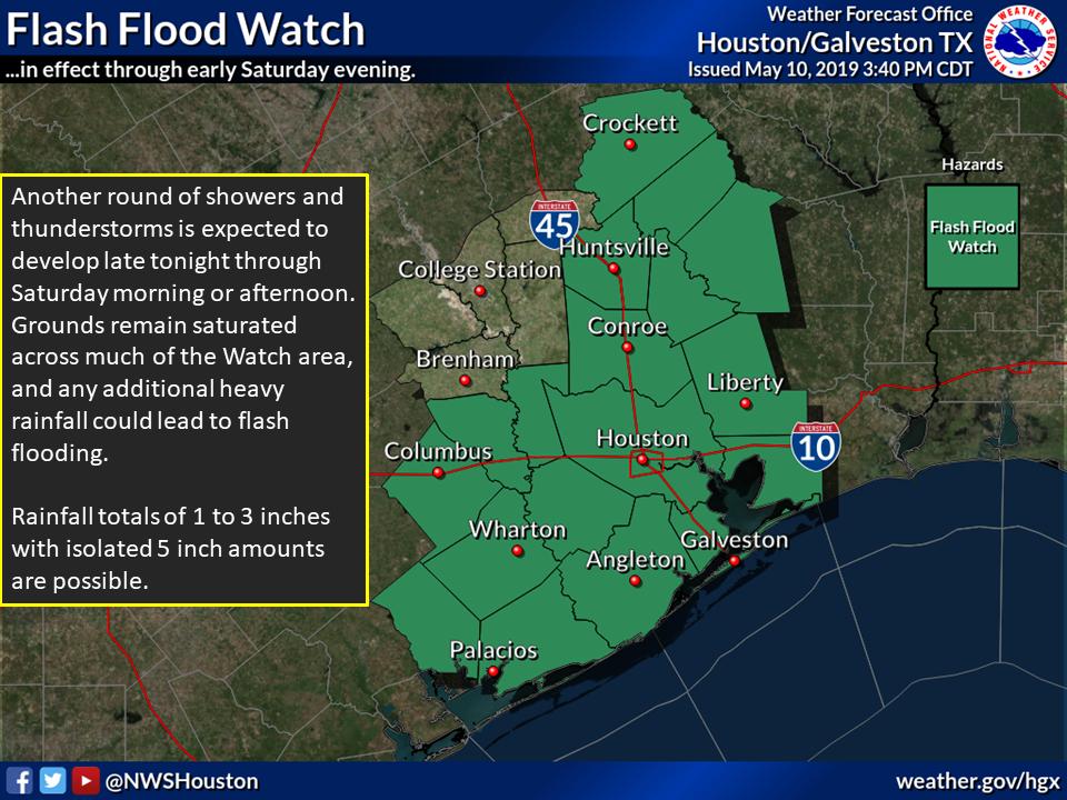 Flash Flood Watch remains in effect until 7 PM CDT Saturday for a large part of SE TX. Another round of storms could develop late tonight thru Sat morning or afternoon. If heavy rains fall on already saturated grounds, flash flooding can be expected. #txwx #houwx #glswx #bcswx