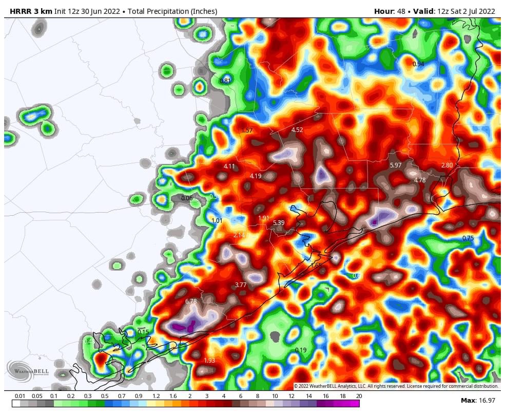 0.76” for today at my home in Beaumont. Some areas around town south Beaumont got about 3”+ and towards Galveston/Port Arthur/Sabine Pass are the winners for today at 3.44” in 24hrs. This mornings rain shield just could not push inland. But again, TOMORROW is the “Main Event” and always has been for all the inches of rain thats been forecasted. Many that got duped today will see possibly inches tomorrow. Sorry for those that didn’t see much or any at all today, but tomorrow is another high possibility it will include more of Setx. As someone mentioned on here a few pages back, high possibility remains AFTER the blob is north of us. Will still be tapped into the gulf pulling/training northward storms. Locally Friday is 80% and Saturday is 70% for the the Triangle. Keeping fingers crossed much more will be included tomorrow.