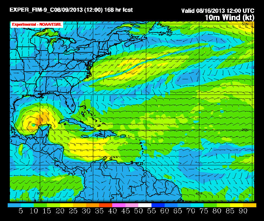 The FIM 9 was somewhat in favor of a circulation developing in the SW Gulf of Mexico near the surface in about 168 hours. This tends to fit the NCEP TC Genesis Probabilities that are 'sniffing' a spin up later this coming week. That said this appears to be more of a rain potential than a wind threat at the moment for our Region which we need. We will monitor the reliable computer guidance to see if something actually develops.