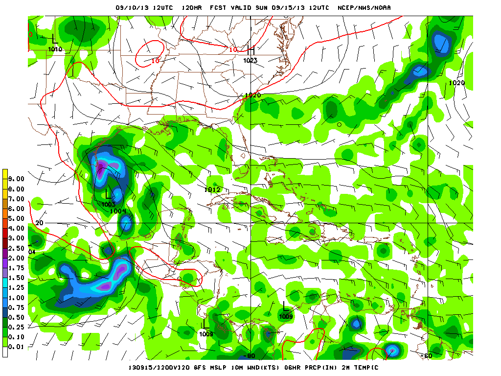 Global forecast models suggest this wave will enter the southern Gulf of Mexico late this week in the Thursday-Friday time period and all show development of surface low pressure. The Bay of Campeche has been a favored area for development this year and tropical systems in this region under favorable upper level conditions have a tendency to spin up quickly. While most of the global models want to track the system into MX much like several other tropical storms have done this year in the southern Gulf, there are some trends that suggest a westward track is not a 100% done deal.