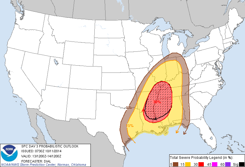 The new Day 3 Severe Outlook from the Storm Prediction Center suggests the greatest threat for severe weather on Monday will be NE of Texas in the Mid Mississippi River Valley Region. That does not mean there is zero chance of severe storms across all of SE Texas. This is likely to be a quick moving mid to early afternoon squall line and the risk of damaging thunderstorm winds and an isolated quick spin up of a tornado or two along the line is not out of the question.