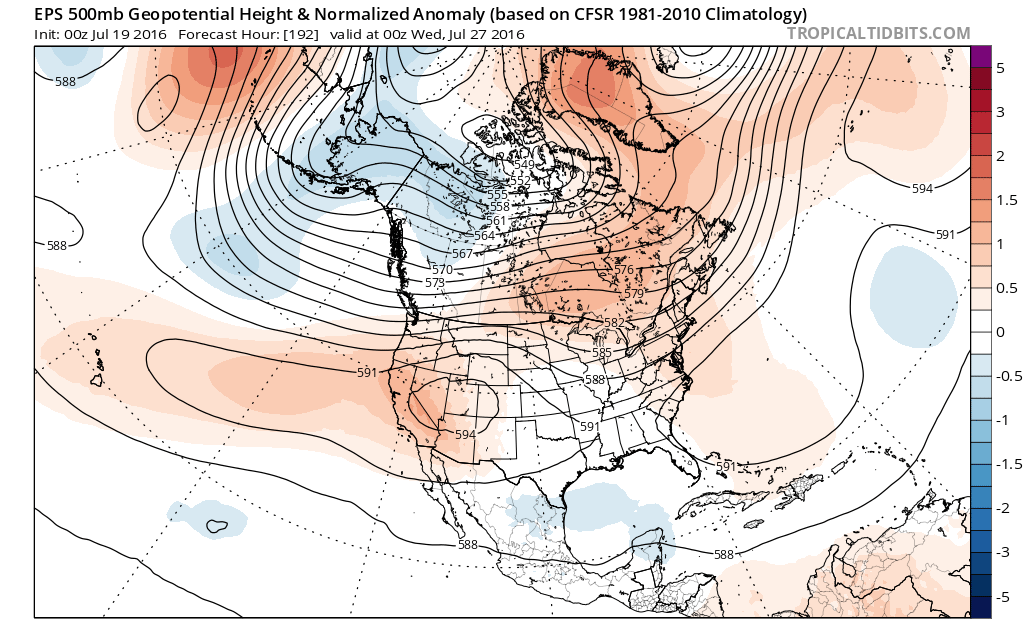 The afternoon Updated Climate Prediction Center Day 6 to 10 Outlook and Day 8+ Analogs are in rather good agreement that a Western Ridge/ Central-Eastern Trough Upper Air Pattern regime will organize next week. The ECMWF and GFS Ensembles are fairly tightly clustered giving credence the sensible weather pattern expected in the Medium Range. It appears that after this weekend, showers and storms will become rather typical as the Azores/Bermuda Ridge allows for an Easterly flow at the surface and a NW flow aloft which tends to favor more convective complexes to develop and drop SE around the periphery of the Western Ridge.
