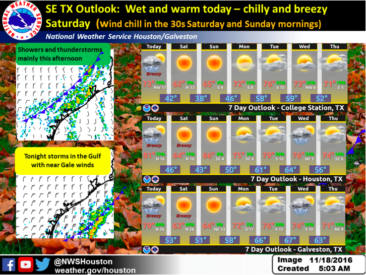 Still some uncertainty regarding the Thanksgiving Day sensible weather forecast. Currently it appears a frontal boundary slowly crosses Texas next Wednesday offering cooler and drier weather next Thursday. We will fine tune the weather outlook as we get a bit closer.