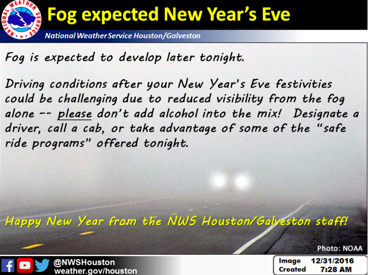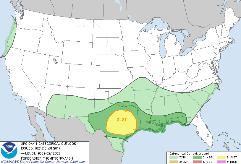 2017 starting off much like 2016 ended with warm and muggy conditions with sea fog along the coast and passing showers. Weak frontal boundary south of College Station will begin to lift back northward allowing an increasingly warm and moist warm sector to spread northward across much of C and E TX today. A potent short wave trough current over southern AZX will eject across TX tonight with strong lift coming to bear across the increasing warm sector. Expect thunderstorms to develop across the Pecos River valley of W TX this evening and spread ESE overnight into better moisture , instability and shear. Scattered development will grow upscale into a MCS after midnight along and just east of I-35 and push across SE TX between 300am and noon on Monday.