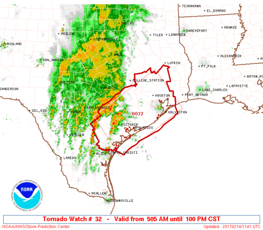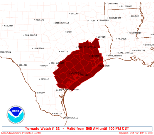TX coast, near the axis of SPC tornado watch 32, represents the most