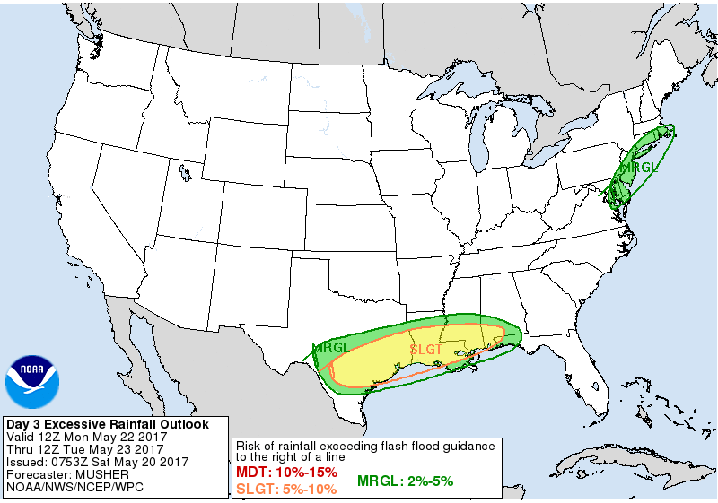 Area should get a break at some point Monday night, but a couple of short waves dropping SE in the NW flow aloft on Tuesday will likely spark a thunderstorms complex over NW TX Monday evening which may arrive in some fashion across SE TX on Tuesday. This could bring additional heavy rainfall to the region along with potential severe weather if in fact it makes it this far SE.