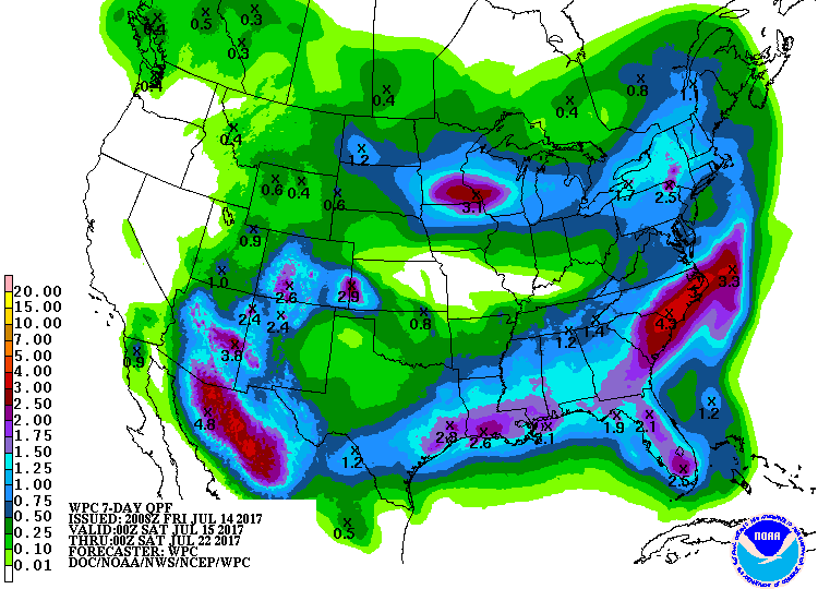 The deeper surge of tropical moisture is inching its way West bound across the Northern Gulf. The afternoon Updated Quantitative Precipitation Forecast suggests rain chances may continue throughout the next 7 days. It is also notable to see Monsoon Season is underway across Mexico and the Desert SW.