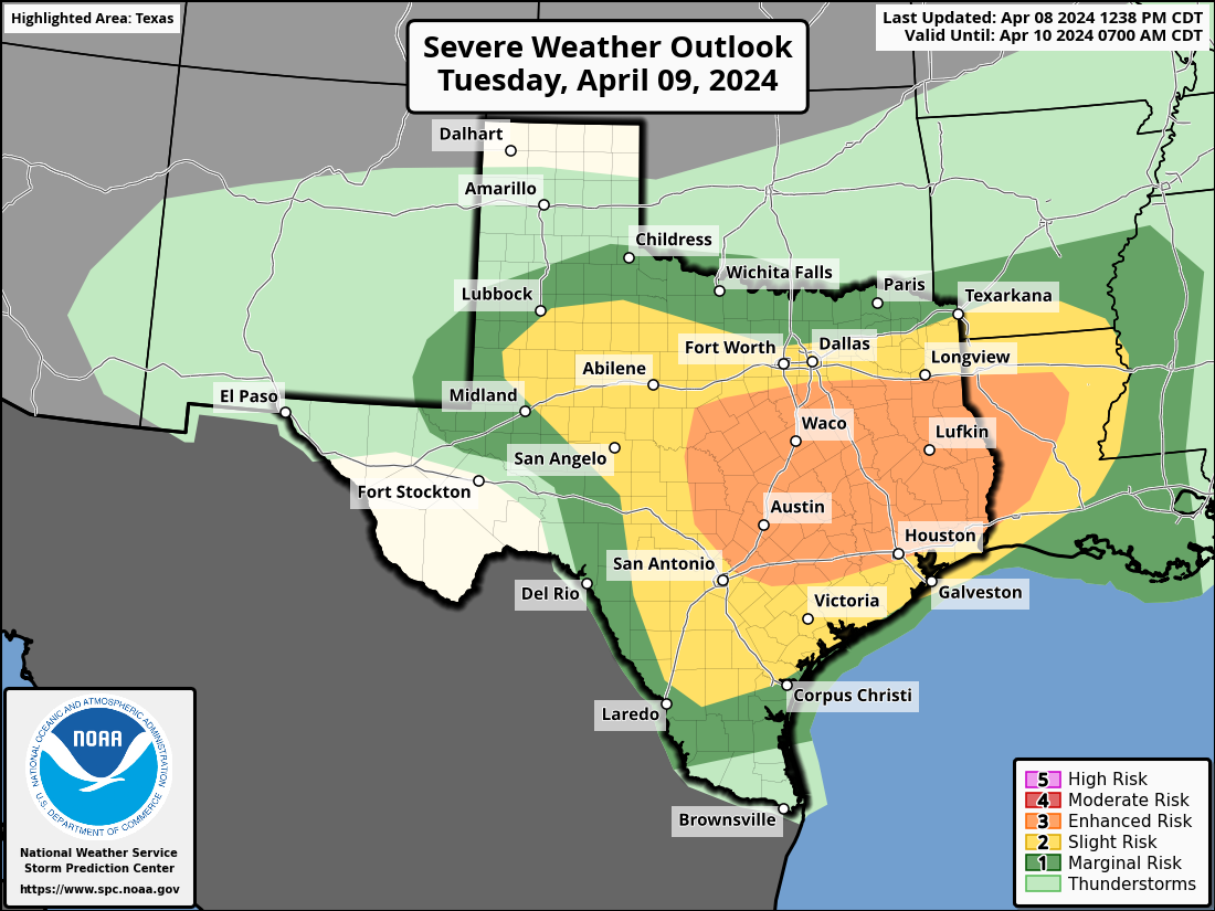 An Enhanced risk has been issued for areas north of I-10.With very large hail being a concern area wide.Strong Tornadoes are also a possibility in northeast portions of SE Texas... Like i said a couple of weeks ago severe weather season is here.Stay weather aware.😉