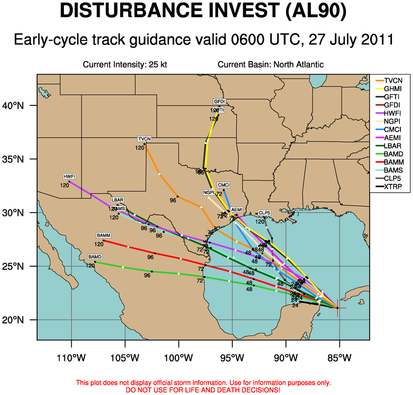 An even further shift to the east? But there appears to be more of a spread. All I know is that I'm hoping a Cuba/ Yucatan land interaction can broaden this sucker out! The last thing we need on the Northeast side of Houston is for the southwest side to get dumped on!