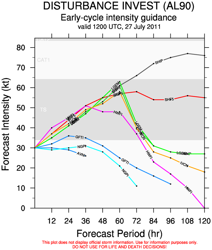 Most models have 90L as a tropical storm, while SHIP has it as a Category 1 hurricane.