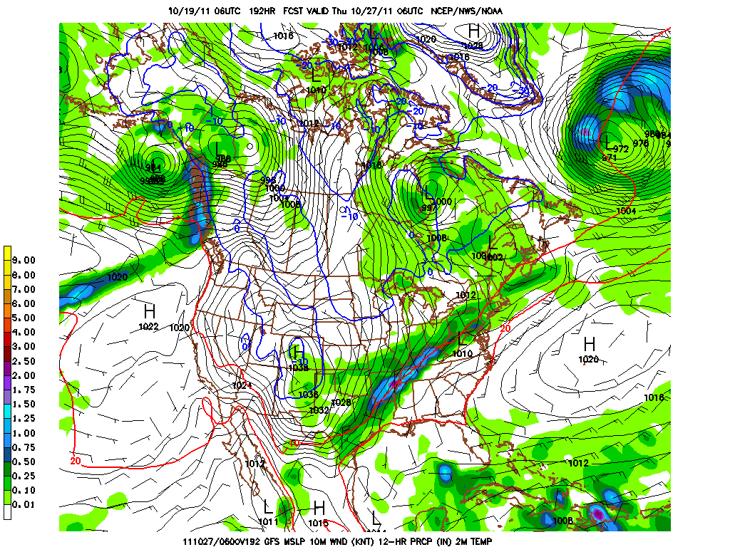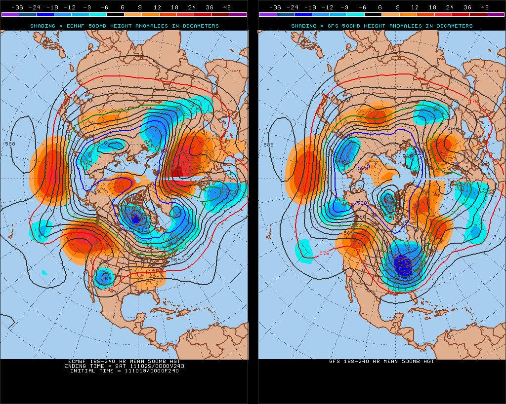 Euro and Canadian completely disagree with the GFS cold solution for next week. They're considerably warmer with a trof hanging back to our west (wetter, too). Perhaps somewhere in between is more likely.