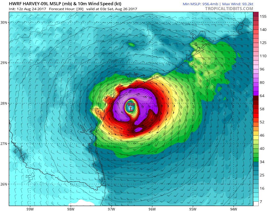 Euro 12z has Harvey landing around Corpus still. We're on the dirty side. The storm is massive and tropical force winds will extend > 100 mi from the center. Hurricane - 50 mi?