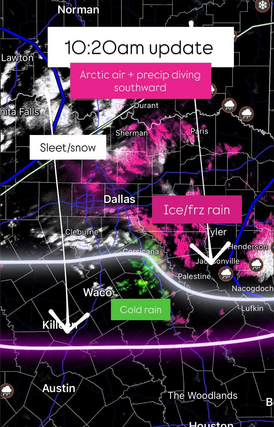 FWIW. In Beaumont, according to models, we were supposed to hit 52 at 10am. It is currently 43 at 10am and still dropping. IMO, I still think coastal areas might be in for more than what’s being forecasted as far as wintery precipitation goes. We are now at the “nowcasting” stage.