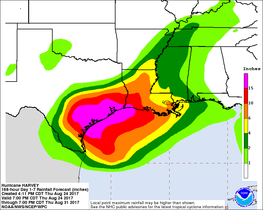 We are looking at not only a historic hurricane landfall, but a historic rainfall event for Texas. Where Harvey's center meanders around over the weekend, we could see rainfall approaching 40 inches - or more. In Houston, I'd look for daily amounts in the 3-6 inch range Saturday-Tuesday. Winds here may approach low-end tropical storm conditions around landfall tomorrow night, then die down Saturday/Sunday and increase again to near tropical storm-strength on Tuesday morning, depending on how strong Harvey is then and how close it passes to Galveston. I'm not expecting extensive damage to the power grid in CenterPoint's service area, but there will be outages.