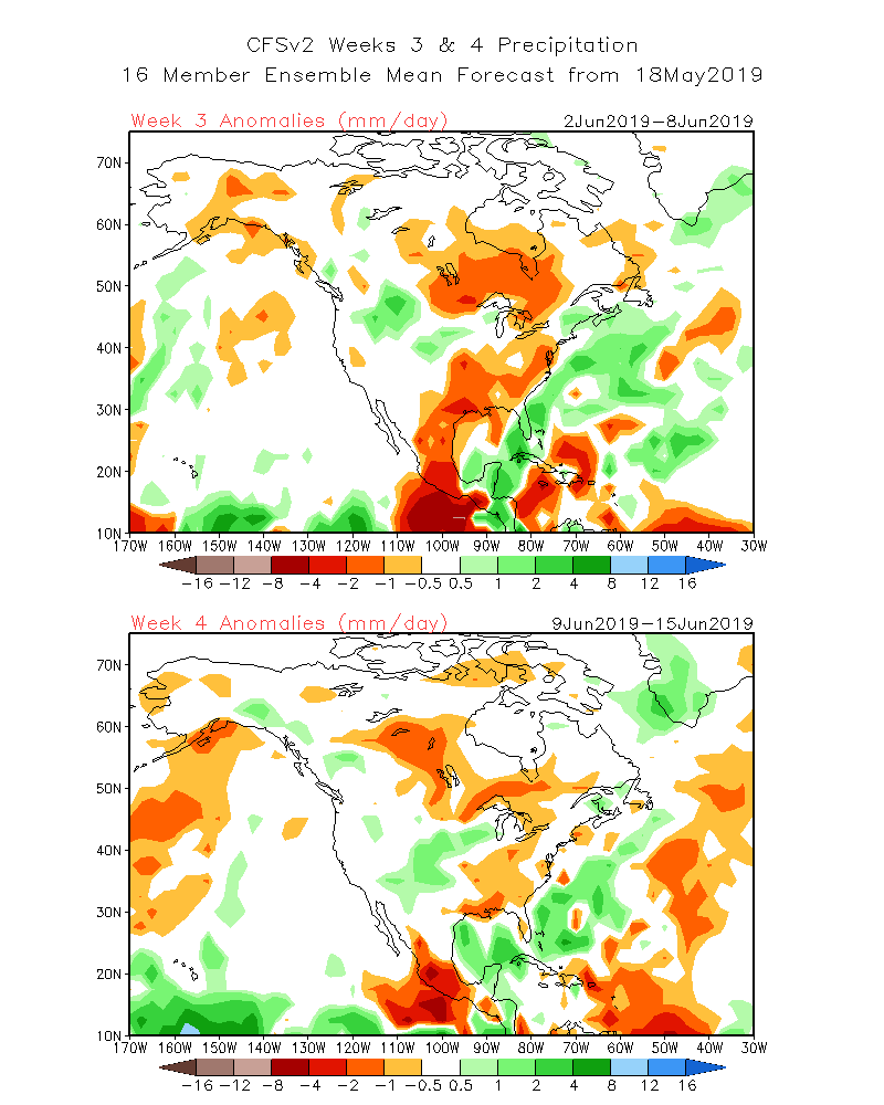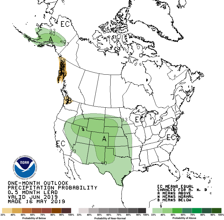 Fourth (last): The CPC does have a slight increase in precip probabilities for June. Looking at the long range, the CPC continues with an above normal precip heading into July and August with a weakness in the central U.S. due to potential ridging out to our West and East.