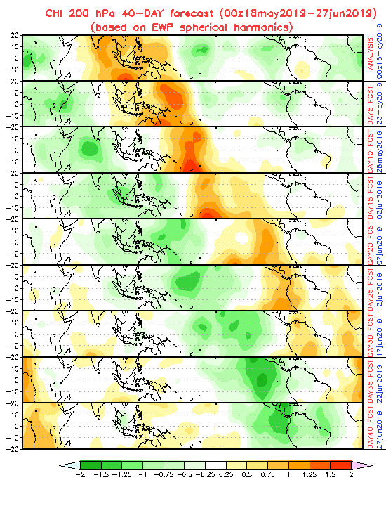 Third: With the High building off to our SE should allow for our typical seabreeze showers and thunderstorms during the heat of the afternoon. Our attention will then need to turn towards the tropics the first part of June. Way too early to be worried about anything, but as always, nice to be aware of the potential. Models have been consistent that an organized wave may develop in the Western Caribbean from some energy crossing southern Central America from the Eastern Pacific. It's important to also note that models are also consistent in doing this it seems like every year around this time with nothing actually coming from it. As Steve mentioned, the MJO will be in a somewhat favorable stage for tropical mischief. Regardless of development, I do believe that we will have some deeper tropical moisture work this way from the Caribbean as we head into June. The CFS weeklies have been pretty consistent with this. Depending on how strong the ridge is to our SE will depend on how much moisture is fetched this way as the bulk of it could get pushed more to our SW in south TX into northern MX.