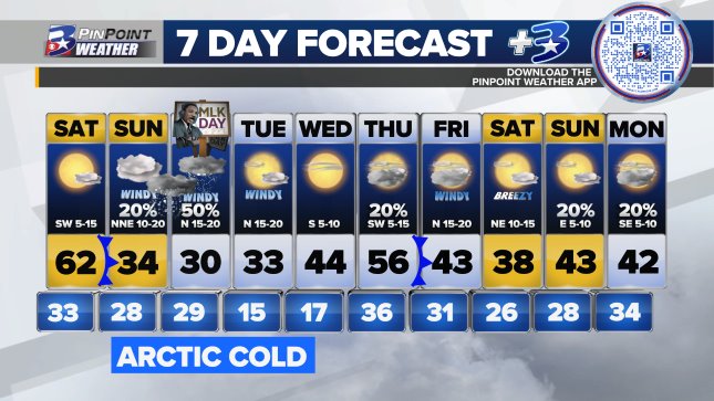 KBTX precip. chances are up to 50% in CLL (KBTX). Hi/Lo: 30/29°F.