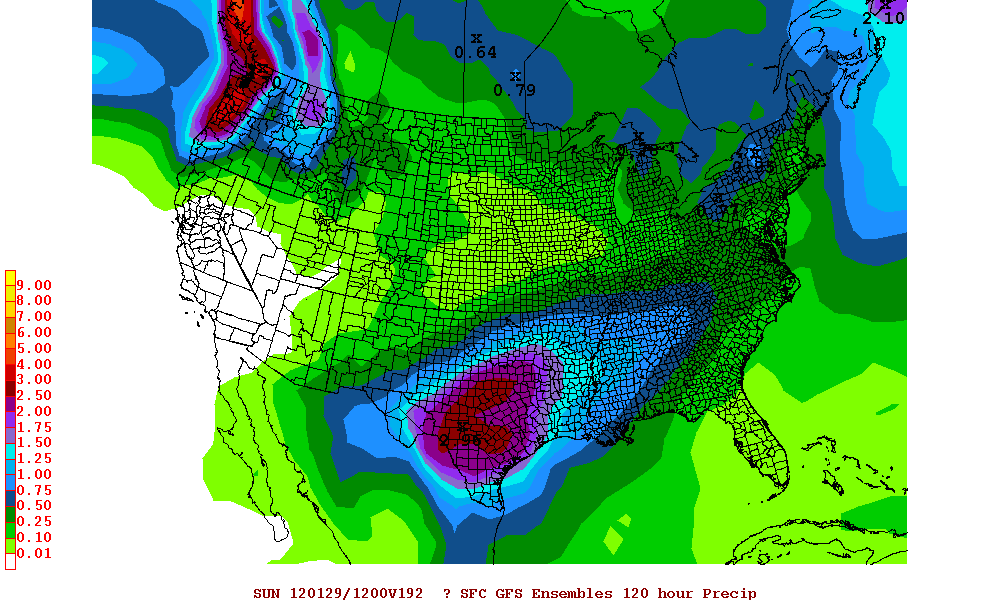Very impressive rainfall totals via the 12Z GFS ensemble mean for 120 hour period ending at hour 192...