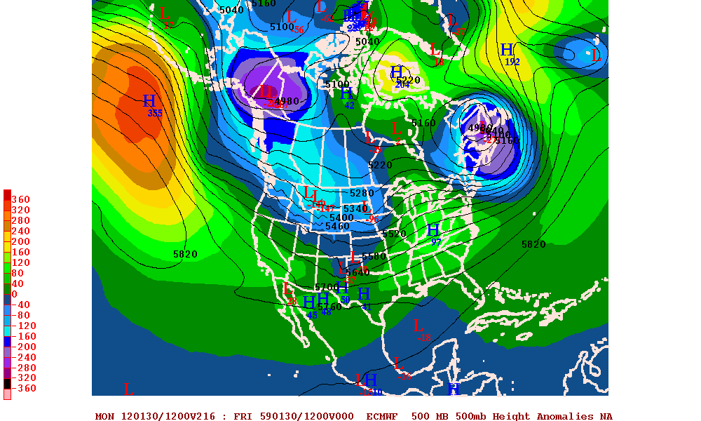 Pretty impressive North Pacific Ridge just wish it was a little farther north to completely dislodge all the cold air in Alaska but either way some impressive heights both rising in the pacific and lowering along the west coast.srainhoutx wrote:Looking ahead to the longer range, the 12Z Euro suggests a deep trough developing across the West/Intermountain West and Plains.