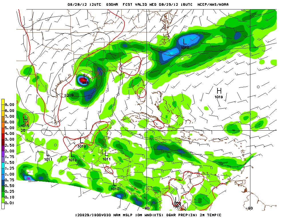 For what it's worth, the 12Z NAM suggests Isaac will hug along Coastal Louisiana heading WNW through 30 hours...