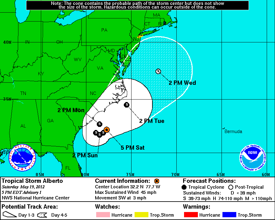Welcome to the 2012 Hurricane Season! Keep in mind the concern this year is "homebrew" which simply put is close to shore development without much lead time for preps. TS Alberto is one of those type of storms today. Always have 2 hurricane plans. One for storms that give you several days to a week to prepare such as Rita/IKE and one that gives you two days or less like Humberto.