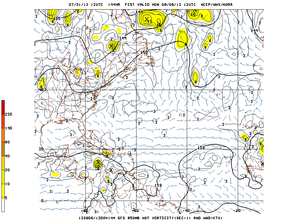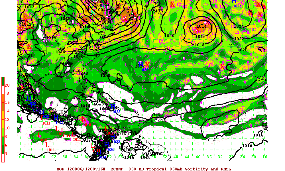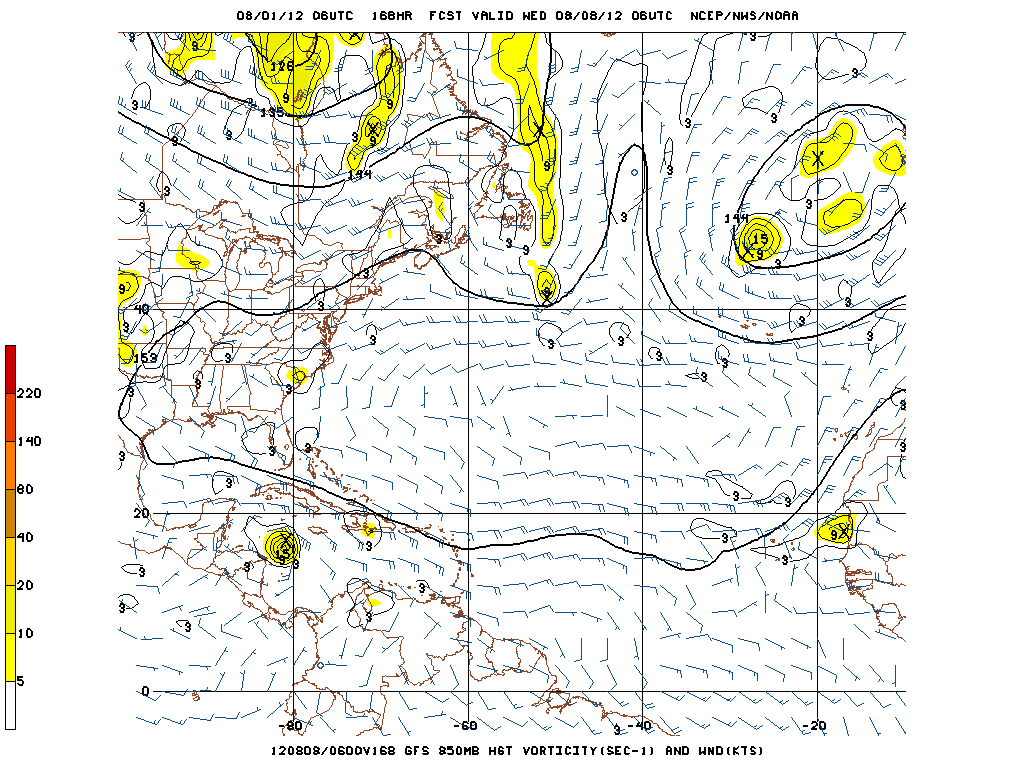The GFS along with the Canadian have been rather robust suggesting development of the disturbance also known as Pouch 10 by the Montgomery Group. The 00/06 Z GFS insists that 850mb vorticity increases as the system nears the Caribbean Islands in about 100 hours at a fairly low latitude and traverses to Caribbean. We will see.