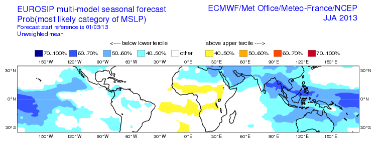 The August-September-October Euro Mean Sea Level pressure anomaly forecast has higher pressures over the Subtropical Atlantic and not as high pressures in the MDR westward to the Gulf. Not lower-than-normal, but not as high as farther north. Suggests less activity in the subtropics and more activity farther south in the deep tropics in 2013.