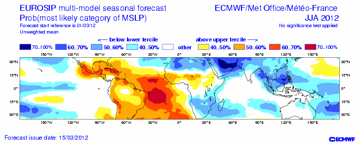 Some interesting trends via the March update of the Seasonal European Tropical forecast. The Eurosip suggest a much different pattern than what we saw last year with normal to lower pressures across the MDR and into the Caribbean and Gulf. It is noteworthy that the Eurosip is also suggesting lower pressure over Texas and near or slightly above normal temps and normal rainfall as well for the June/July/August time frame. We will see.