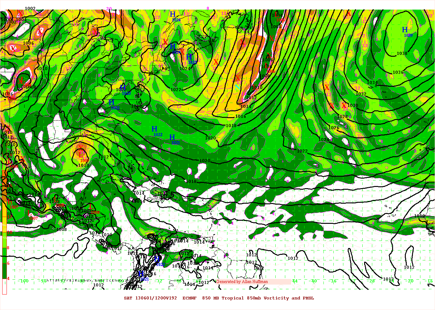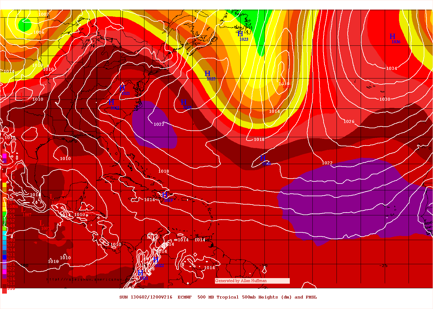 2012 Euro forecasted higher than normal sea level pressure in the deep tropics. 2013 Euro forecasts normal sea level pressure for the deep tropics. This could mean a more active Caribbean and Gulf, which increases risk for landfall on the Gulf Coast.