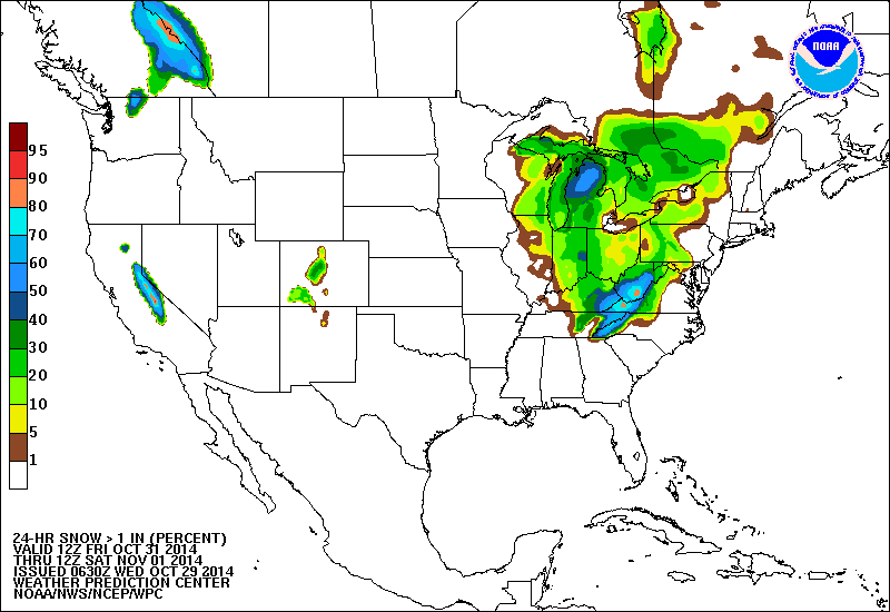 The overnight guidance has trend colder as we start November. Temperatures in the 20's across the Northern Plains will push S with a secondary front on Halloween bringing gusty Northerly winds and falling temperatures. It looks like some of colders spots may reach the 40's for lows on Saturday night/Sunday morning with upper 60's to low 70's for highs as Day Light Savings Time ends. This is due to a stronger Eastern US trough and piece of cold Canadian air sliding S with a cold Canadian High Pressure cell settling into the Plains/Mid West. Lake effect snow showers are possible Friday night into Saturday with snow showers possible as rather S as the Appalachians of Virginia and the Carolinas.