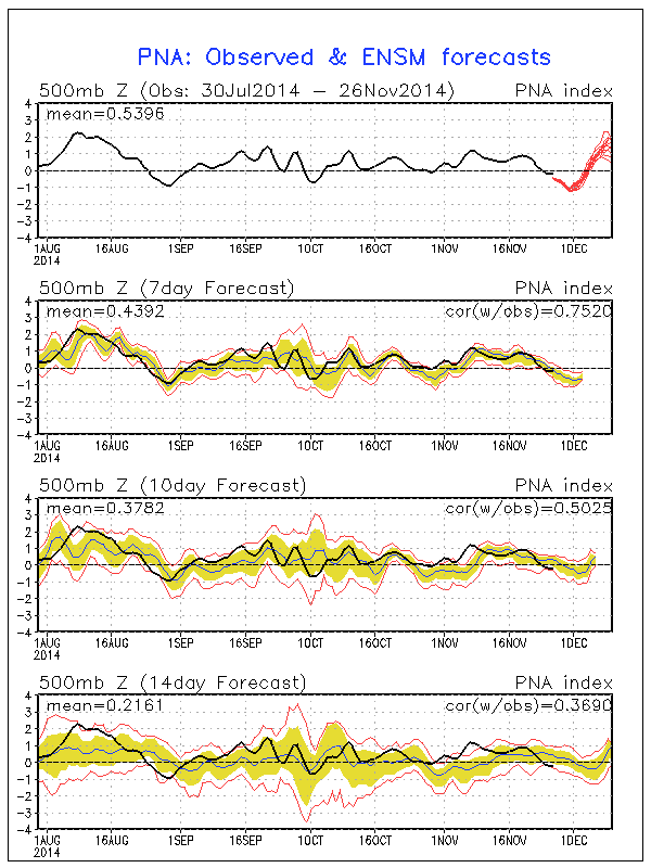 As we get closer to December, the big long lasting warm up is loosing its legs. The 12Z parallel and old GFS are sniffing several shots of cold air in the medium range, but they are transient. What is intriguing is the tropical forcing developing as a WPAC Typhoon wraps up and the Aleutian low increases in strength which is very common in a +PDO regime. The PNA is still expected to turn strongly positive while the AO drops back into negative territory around the 8th to 10th of December. The GEM is also onboard with this sort of solution. If an amplified MJO pulse develops and swings back into the Western Hemisphere, look for a digging trough across the Inter Mountain West once again and if the NAO becomes negative, a stout blocking regime could develop. There are a lot of moving parts across the Northern Hemisphere right now and add a SSW event into the mix, we may see a stormy and cold later half of December into January. We will see.