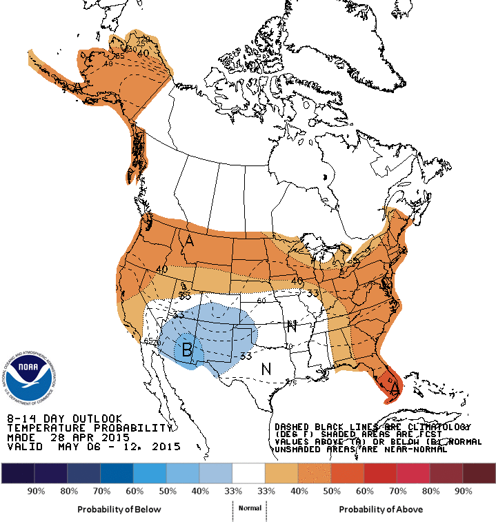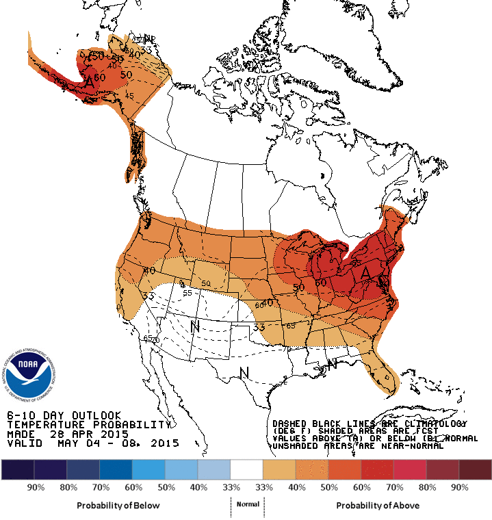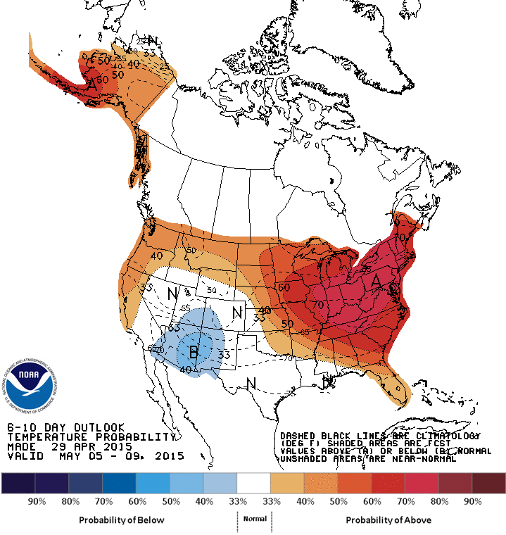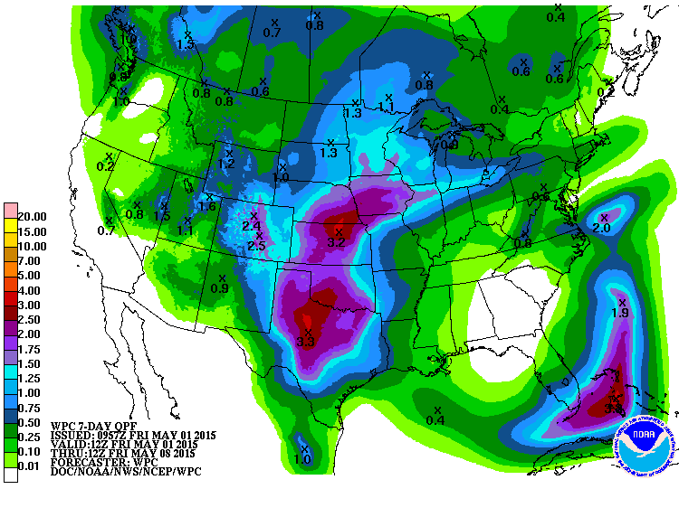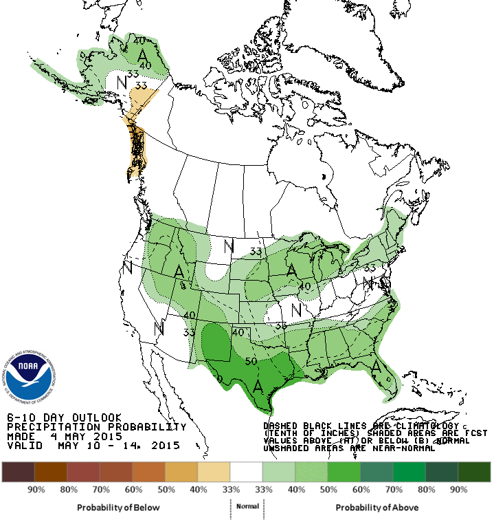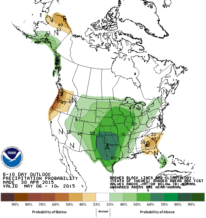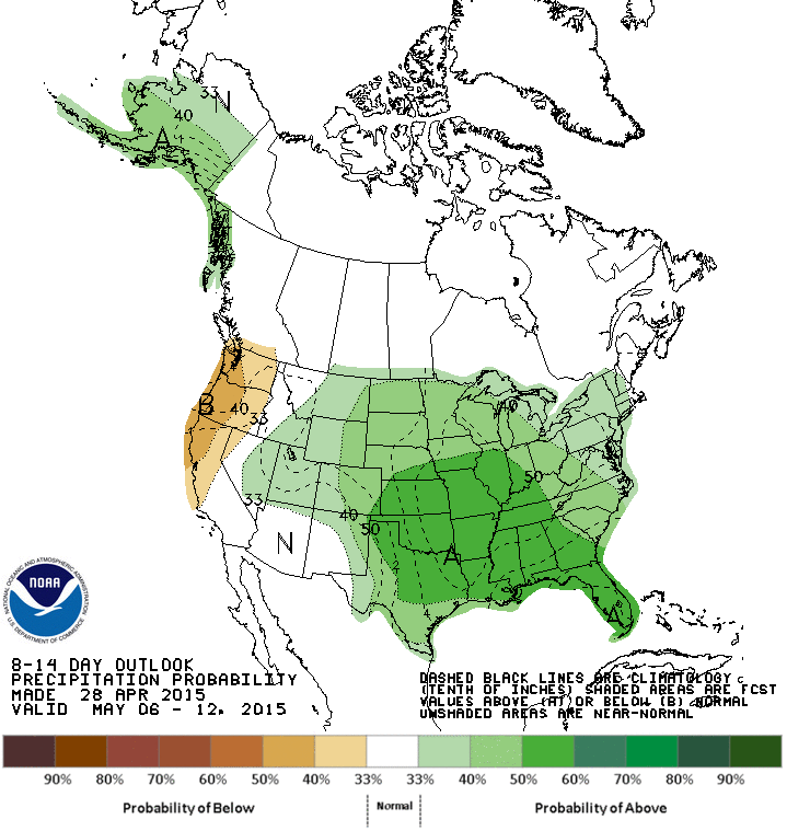 The 04/29/2015 Climate Prediction Center Update continues to advertise a wet and stormy pattern is possible as we enter the first full week of May during mid next week period in the Day 8+ range. Indications via the ensemble guidance suggest severe storms may be possible next week across the Great Plains with some possibility of heavy rainfall returning to Texas and Oklahoma. Further East in the extended range, the various computer model schemes are suggesting a sub-tropical low may develop near the Bahamas and East of Florida.