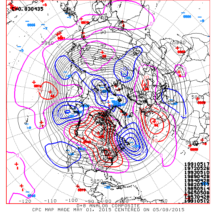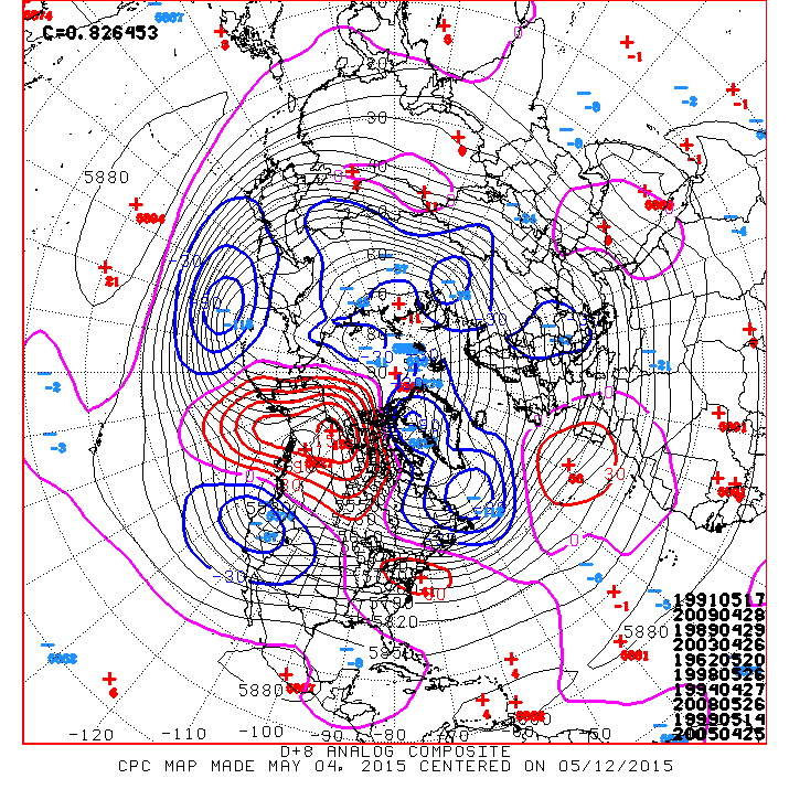 A quick update regarding the potential pattern as we begin May across the Region. The Climate Prediction Center Day 8+ and Day 11+ Analogs based on the ensemble guidance suggests cooler and wetter weather may well be the theme as a broad area of lower pressures establish across the West and Southwest. Typically as wavelengths become longer and we transition to a more zonal flow, convective activity is suggested to increase as the Polar jet retreats North and the sub tropical jet becomes very noisy which is typical of an El Nino pattern.