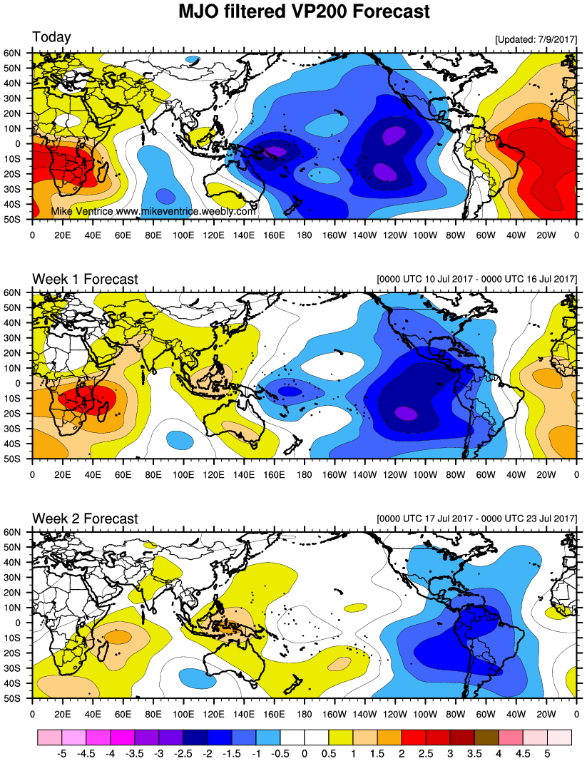 I am watching for the possibility for more favorable conditions around mid July into early August as the Madden Julian Oscillation moves East of the Dateline and toward the Pacific Mexico Coast and then enters the Western Caribbean around July 11th to 15th. The morning Update MJO and CCKW graphics suggest we may need to turn our attention toward the Tropics as we get a bit closer to Peak Season in the Atlantic Basin.