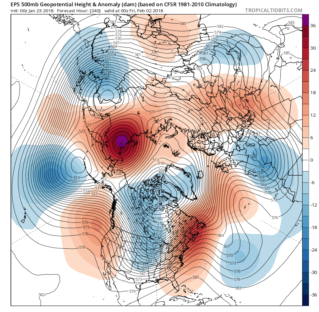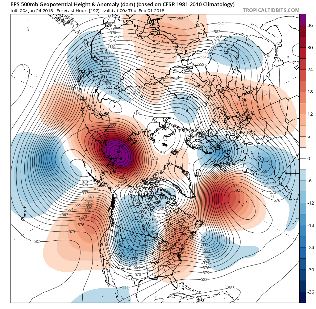 In very simple terms, these are various oscillations (Western Pacific, North Atlantic, Pacific North American and Eastern Pacific) or Telecommunications Indices that give clues as to what our sensible weather may bring in the longer range. The Western Pacific Oscillation is predicted to be very negative suggesting strong Ridging into the Bering Sea/ Arctic Circle indicated by the deep red shades in the 00Z ECMWF EPS. The Eastern Pacific Oscillation is negative, but not as much suggesting a Eastern Pacific Ridge offshore of the California/Western Canada Pacific Coast extending slightly into Alaska. The Pacific North American Oscillation in also negative which assists in developing an Upper trough indicated by the blue shading in the ECMWF EPS (ensembles). Remember there are about 50 individual ensemble members in the ECMWF, so color shading is basically smoothed out to reflect the various differences between the individual ensemble member solutions.snowman65 wrote:Can someone tell me how to read this chart (in a semi-understandable way)..lol