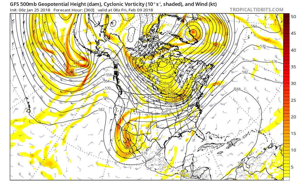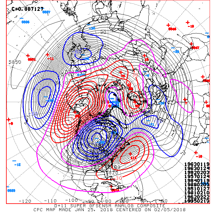 The morning Updated Climate Prediction Center Day 11+ Analogs are suggesting a cross Polar flow with a very deep Upper Trough situated across the Central portions of North America. I noticed the deterministic GFS is indicating some -50F readings across portions of Canada approaching -30F to -40F along the US/Canadian Border around the second week in February.