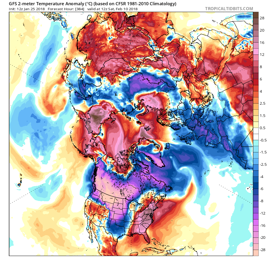 Clearly the GFS has gone bonkers (highly scientific word) with a 1070+ Arctic High Pressure over Canada. From the Northern Hemisphere view, you can see the coldest air will be on our side of the Globe. Now will those -40F in Montana and near -50F temperatures in Canada plunge all the way down the Plains into Texas? Time will tell.