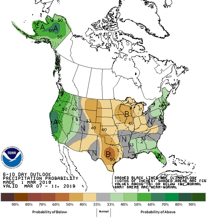 Looks like a chance for some showers and possibly some thunderstorms Sunday though next Tuesday before a bit stronger cold front arrives ushering in slightly below normal temperatures and a dry spell developing. Fortunately for drought parched California, it looks very unsettled with abundant mountain snow fall and potentially flooding rainfall at lower elevations.