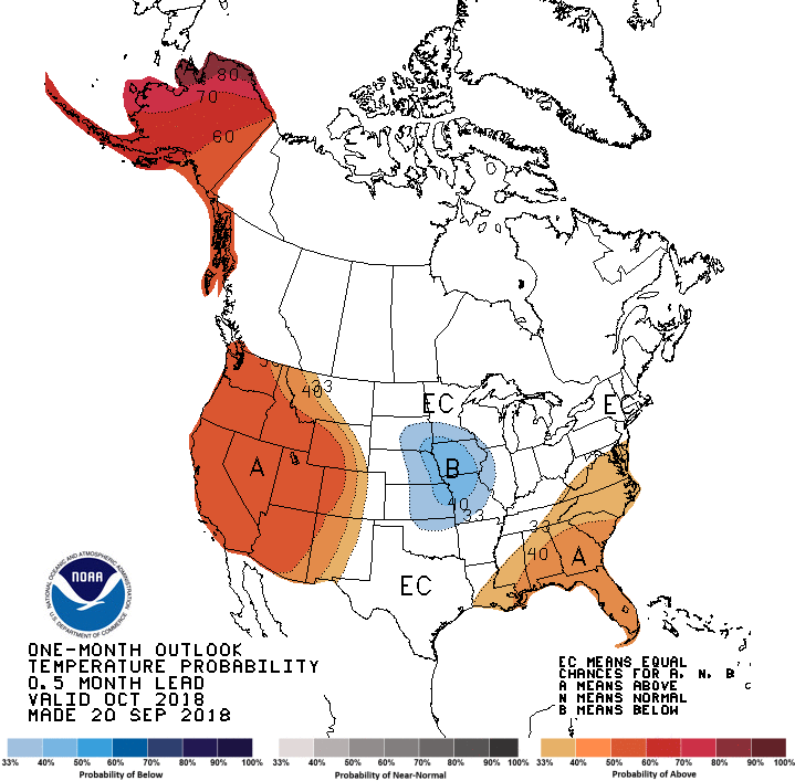 The Climate Prediction Center October Outlook is out and it suggest near to slightly below normal Temperatures and above normal Precipitation.