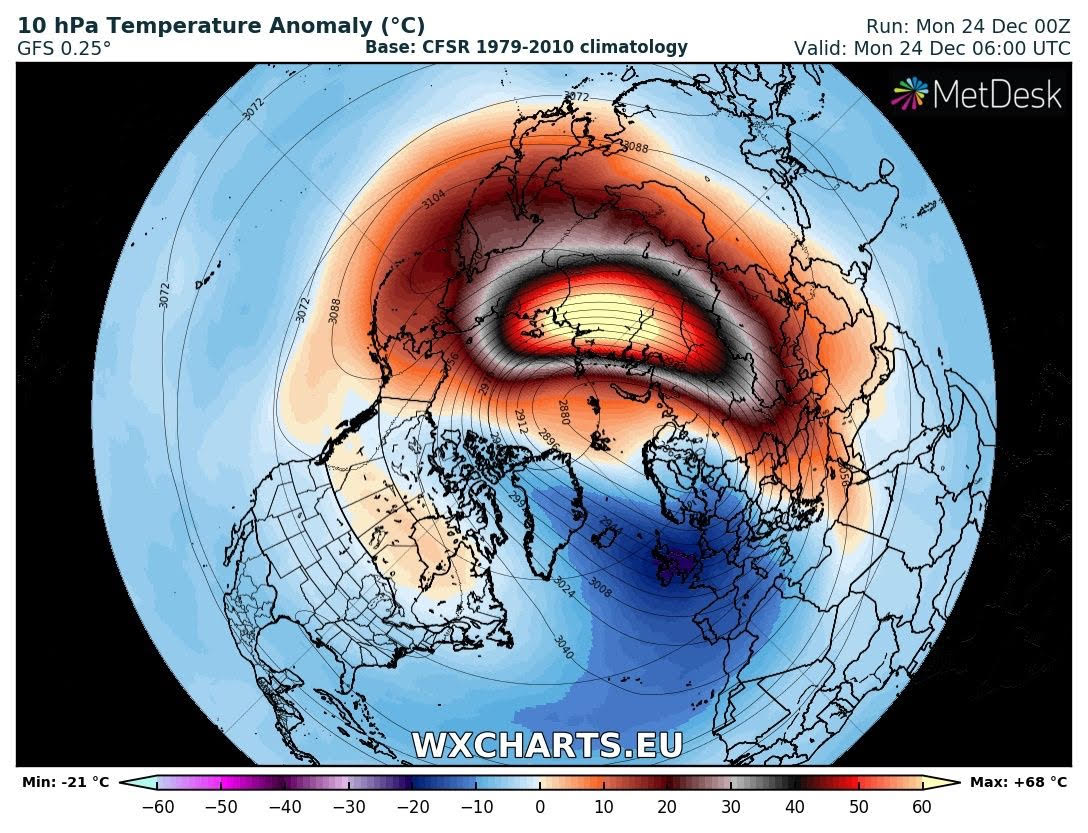 Those winds are associated with a Sudden Stratospheric Warming (SSW) event that could lead to colder temperatures for part of Europe and the Eastern United States depending on where it sets up and how strong it is. The GEFS is coming in a little more aggressive that the west to east flow we normally see could reverse direction some by the beginning of the New Year. If that happens it could open the door for colder air.