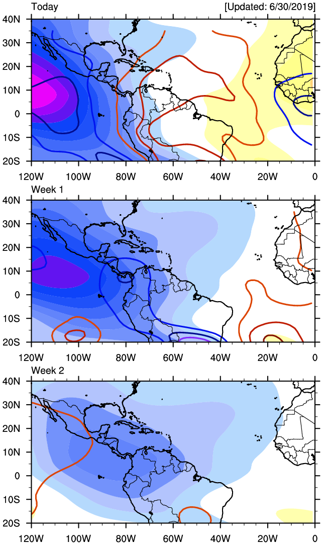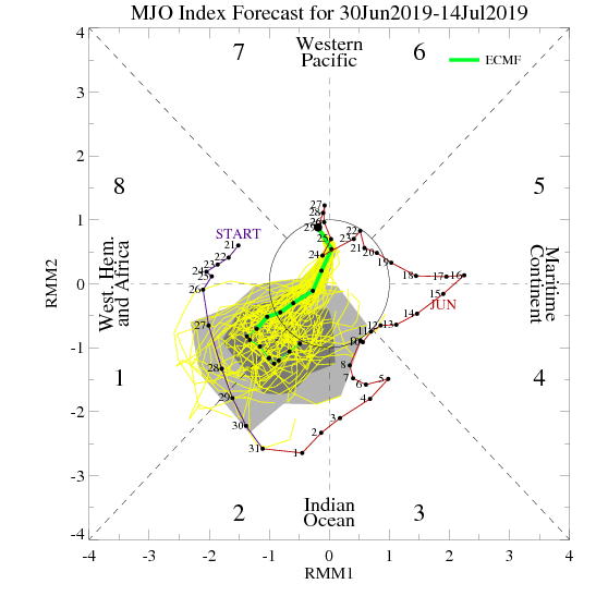 srainhoutx wrote: ↑Sun Jun 30, 2019 3:11 pm I do not see the rain chances completely disappearing throughout the first week of July for our Region. The Bermuda/SE Ridge is not overly strong and with an onshore flow continuing into late next week, I believe we will have at least an isolated shot of heat of the day seabreeze showers/storms into next weekend. Beyond that, the MJO may come into play across the Western Atlantic Basin and the Gulf as mid/late July comes around.