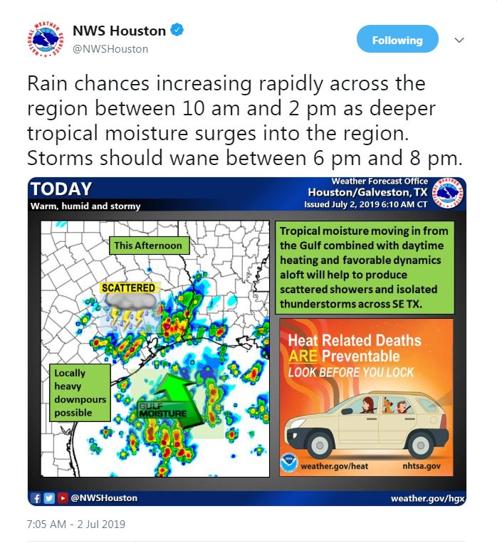 In the meantime, rain chances are good through Wednesday, maybe July 4th with the Gulf surge.